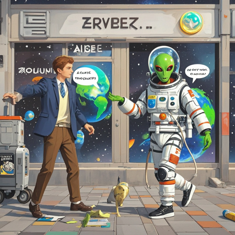 一位外星人误降地球,为了生存,他开始学习地球的生活。他学会了走路、说话,甚至找到了一份工作。然而,有一天,外星人遇到了一个地球人,那个人对他的外星外貌感到好奇。外星人害怕暴露自己,于是决定逃跑。结果,他跑进了一家太空服店,穿上太空服,却被路人误认为是宇航员,纷纷要求合影。