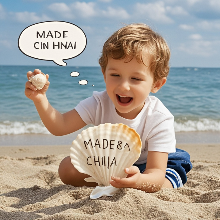 在一个海滩上。一个小男孩正在玩沙子,突然他发现了一个漂亮的贝壳。他高兴地拿起贝壳,想要给妈妈一个惊喜。然而,当他把贝壳拿给妈妈时,妈妈却一脸吃惊地问道:“孩子,你是怎么找到这个贝壳的?海里的贝壳怎么会有字?”小男孩一愣,拿过贝壳一看,上面写着两个字:“Made in China”。全家人忍不住笑翻了,这真是一个来自“中国制造”的搞笑瞬间!