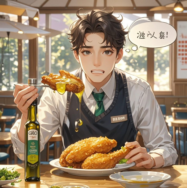 在一个餐厅里。有一位顾客点了一份炸鸡,服务员很快将炸鸡端上桌。顾客拿起一块炸鸡,却发现它非常油腻。他皱起眉头,对服务员说:“这个炸鸡怎么这么油啊!”服务员听后,一本正经地回答:“因为这只鸡它是用橄榄油游过来的。”听到这个解释,顾客忍不住笑出了声,同时也意识到自己的幽默感似乎需要提高一下。