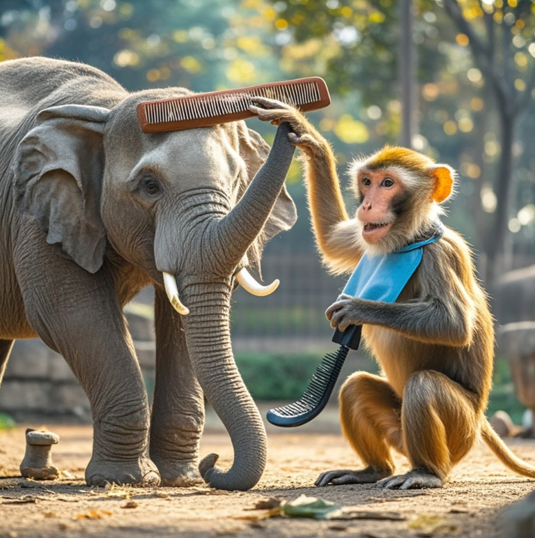 在一个动物园里。一只调皮的猴子喜欢捉弄动物园的工作人员。有一天,他决定玩一个特别的把戏。他找来一把梳子,假装自己是一名理发师,开始给其他动物理发。结果,他给一只大象理发时,不小心把梳子卡在了大象的头上!大象被梳子卡住的样子实在是太滑稽了,引得游客们哈哈大笑,而猴子则趁机逃之夭夭,留下了一片欢声笑语。