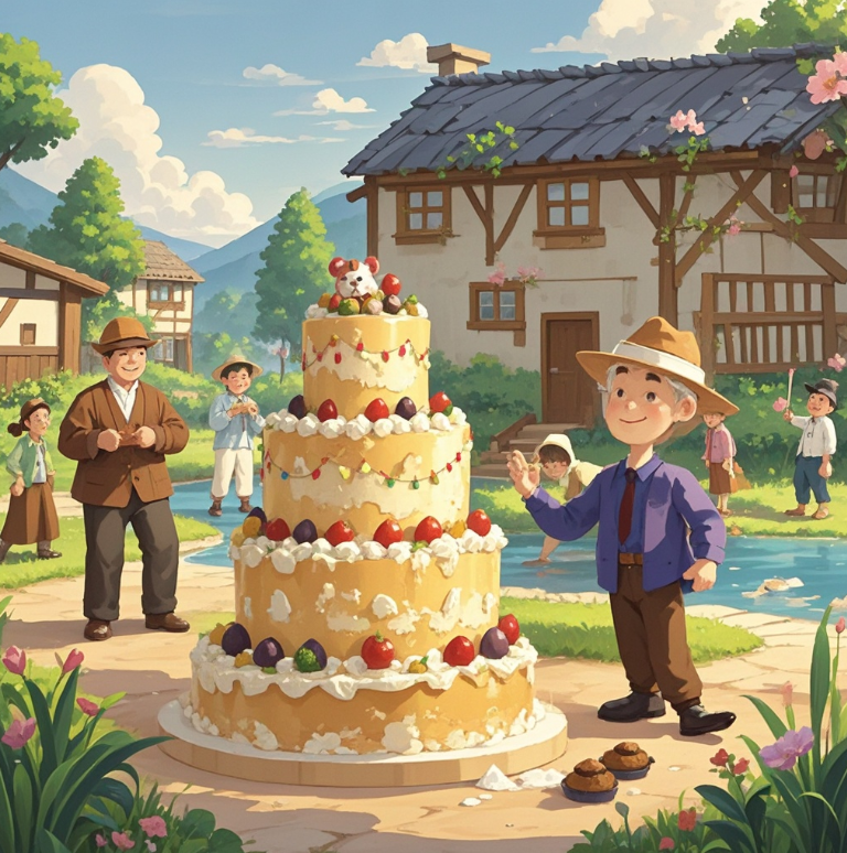 在一个小村庄里。有一天,村民们听说村长大人要来视察,纷纷准备着迎接。其中有个名叫小明的村民,他为了给村长大人留下深刻印象,特意准备了一个巨大的蛋糕。然而,在送到村长面前的时候,他不小心绊倒了,整个蛋糕扑通一声摔在了村长大人的头上!大家顿时哄堂大笑,小明也尴尬地笑了起来,这可真是一个“甜蜜”的开场啊!