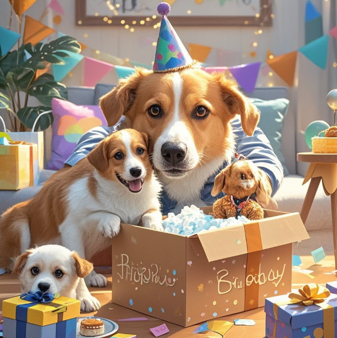 有一只狗,它的主人很疼爱它,总是给它买很多好吃的。这只狗非常聪明,它知道自己生日快到了,于是决定给主人准备一份特殊的礼物。