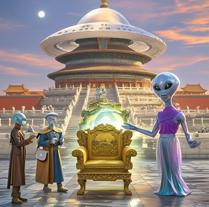 外星人使用超能力,轻轻地拿起龙椅,放在了他们的飞碟上。他们兴高采烈地回到了外星老家,把龙椅放在了他们的博物馆里。从此以后,外星人每次来到地球,都会去中国看看他们的龙椅,回忆起那段有趣的旅行。