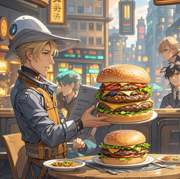 就在这时,一个好心人走过来,看到时间旅行者的尴尬处境,主动帮他解决了这份大汉堡。时间旅行者感激不已,他继续在未来的城市探险,留下了许多有趣的故事。