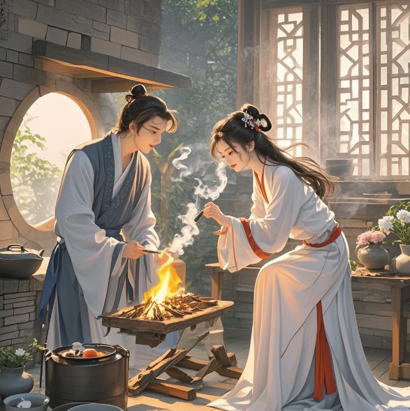 事有凑巧,隔壁大媳妇刚好过来借东西,小夫妻的这段话,一字不落全听进去了。她十分羡慕,回到家中,就对老公说:“隔壁这对小夫妻,真是恩爱。丈夫见到妻子吹火做饭,便作诗吟咏她。你难道不能学着点儿吗?”