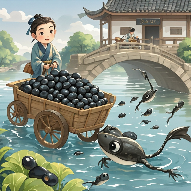 隋朝有个人,载着满满一车黑豆上京城去卖。过一座桥的时候,车子突然倾翻,车上的黑豆全部掉进了水中。他急忙赶回家中,招呼家人一起下河去捞豆子。