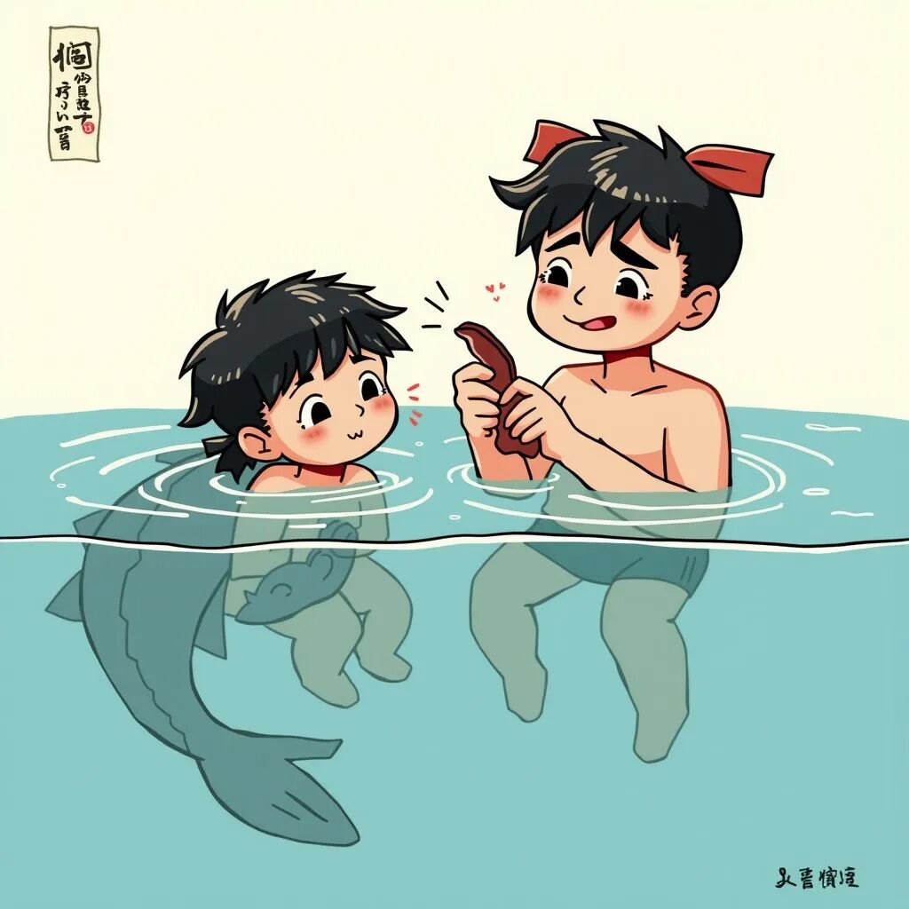 于是,兄弟俩便来到水潭边。哥哥先脱下衣服,顺手从衣袋里摸出几块肉千,捏在手中。然后跳进潭里,潜入水中