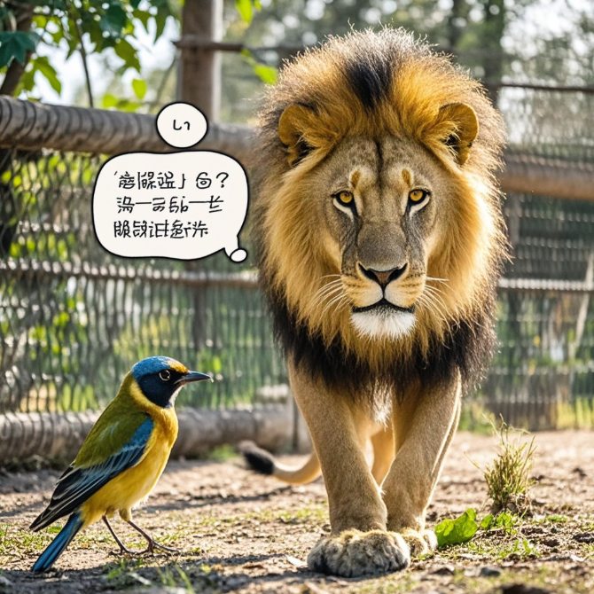 一只小鸟误飞进了动物园的狮子区,狮子看到后,慢悠悠地走过去说:“小鸟啊,你这是哪个单位啊?你这个单位太落后了!”小鸟回答:“我是动物园的记者,专门来采访你们的!”