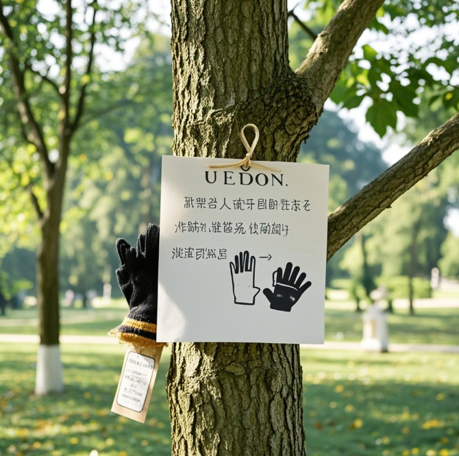 有一位大叔在公园里捡到一只手套,于是他在树上挂起了一张告示:“拾到一只手套,失主请带着另一只手来认领!”