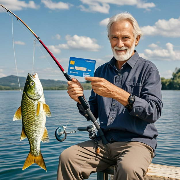 有一位老爷爷钓鱼时实在太无聊,于是他在鱼饵上系上了一张信用卡,结果没多久就钓到了一张银行卡。