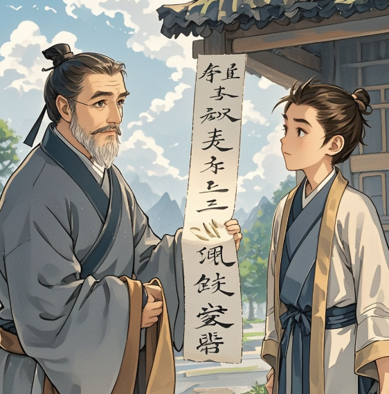 父亲要出远门,临行前嘱咐儿子道:“如果有人问你父亲在不在,你就说我外出办事去了,请他进来,并请他喝茶。”说罢,想到儿子有些呆头呆脑的,唯恐他忘记了,就写了张纸条交给儿子。