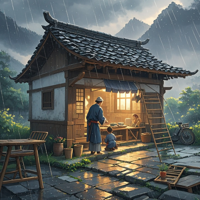 天下起了连阴雨,迁公家屋外下大雨,屋内下小雨,一夜之间挪动了好儿次床铺,最后还是一点干的地方都没有,老婆孩子不是哭,就是骂,闹个不停。