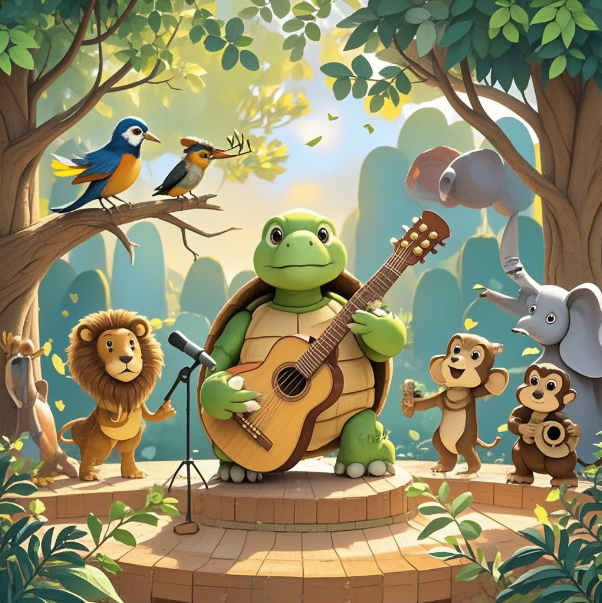 乌龟站在舞台上,缓缓地拿出了一把吉他。大家都很惊讶,不知道乌龟要做什么。只见乌龟小心翼翼地拨动吉他弦,竟然发出了一段动听的旋律。