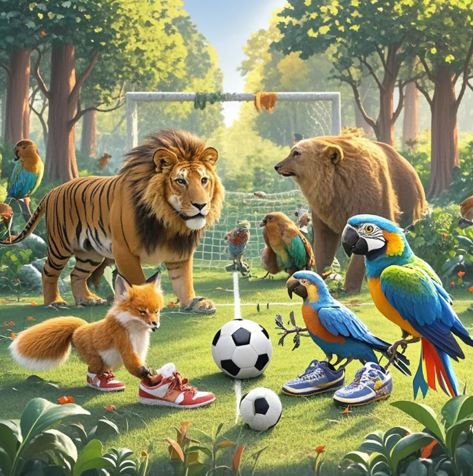 在一个遥远的森林里,动物们决定举办一场足球赛,以庆祝森林每年的丰收。比赛分为两个队伍,一边是“猛兽队”,包括狮子、老虎、熊等猛兽;另一边是“飞鸟队”,由各种鸟类组成。