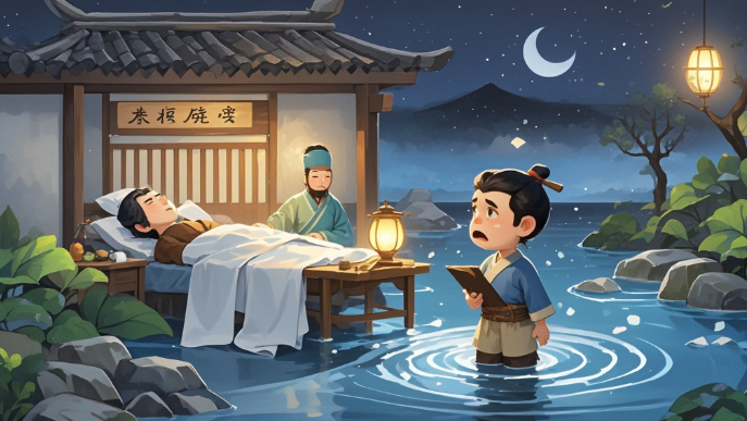 庸医乘着天黑,跳入河中浮水逃走。他气喘吁吁地跑回家中,看见儿子正在灯下苦读医书。庸医哭丧着脸,劝儿子道:“儿啊,你先不要着急读书。