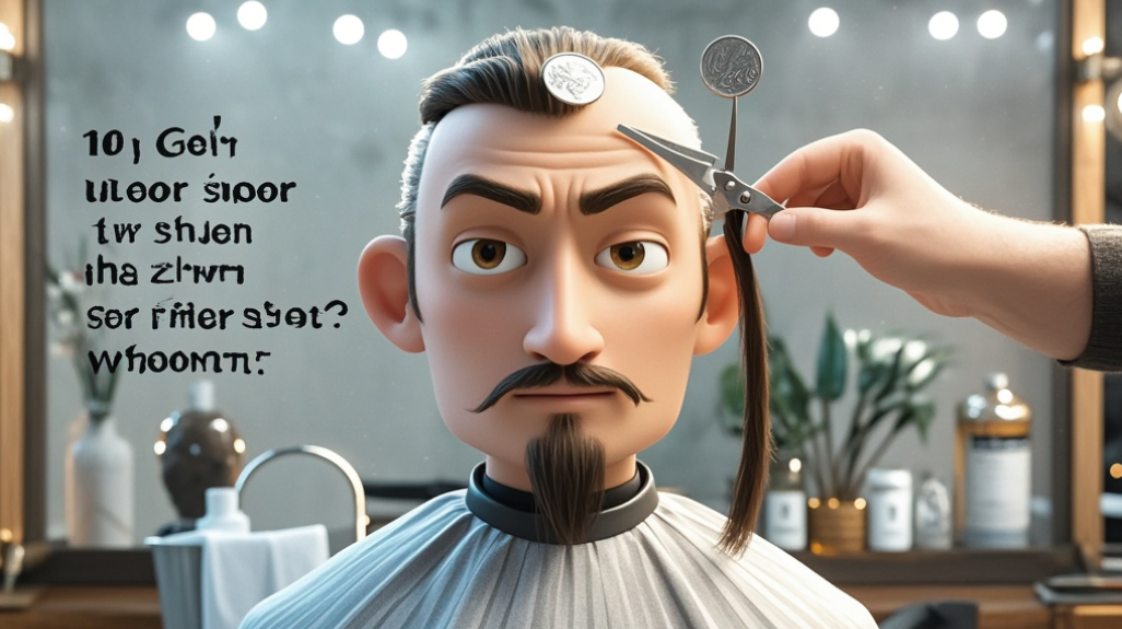 一名男子到理发店理发。男子对理发师说:“请你把左边的头发剪短点,右边的头发让它垂到耳朵下面,然后在脑门上剪秃头一块,大小像五角硬币就可以了。对了,还要留下一缕长发,使我能把它一直拉到下巴。”