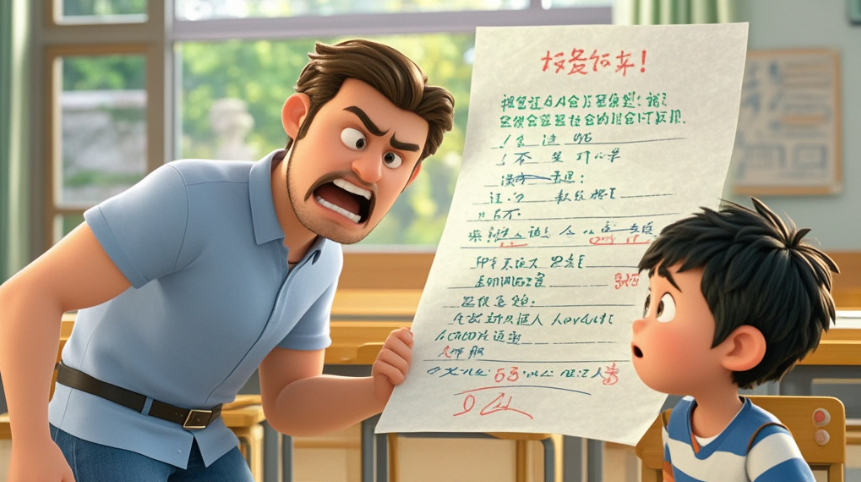 “你还敢撒谎?!这里白纸黑字写着'经常和同爸爸说:学打成一片’,你还否认?”