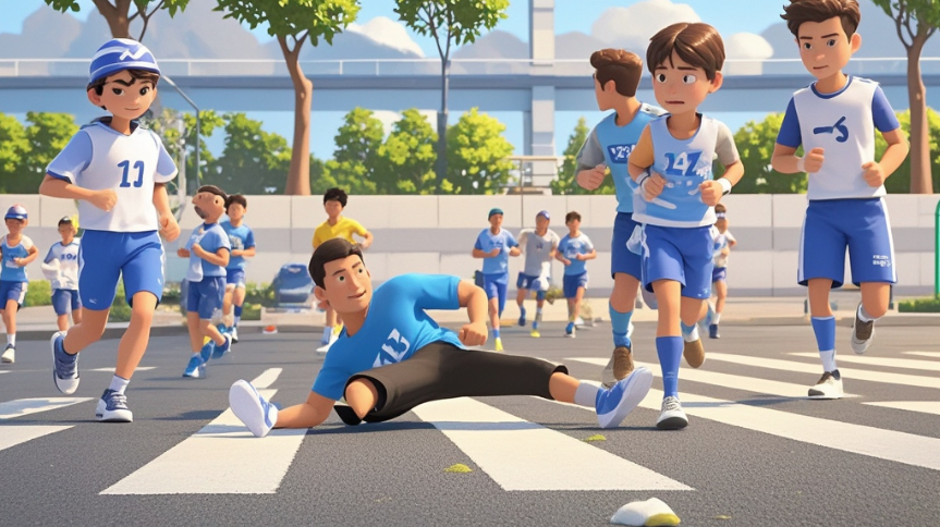 早上训练,教练带队,跑着跑着,一名队员摔倒了