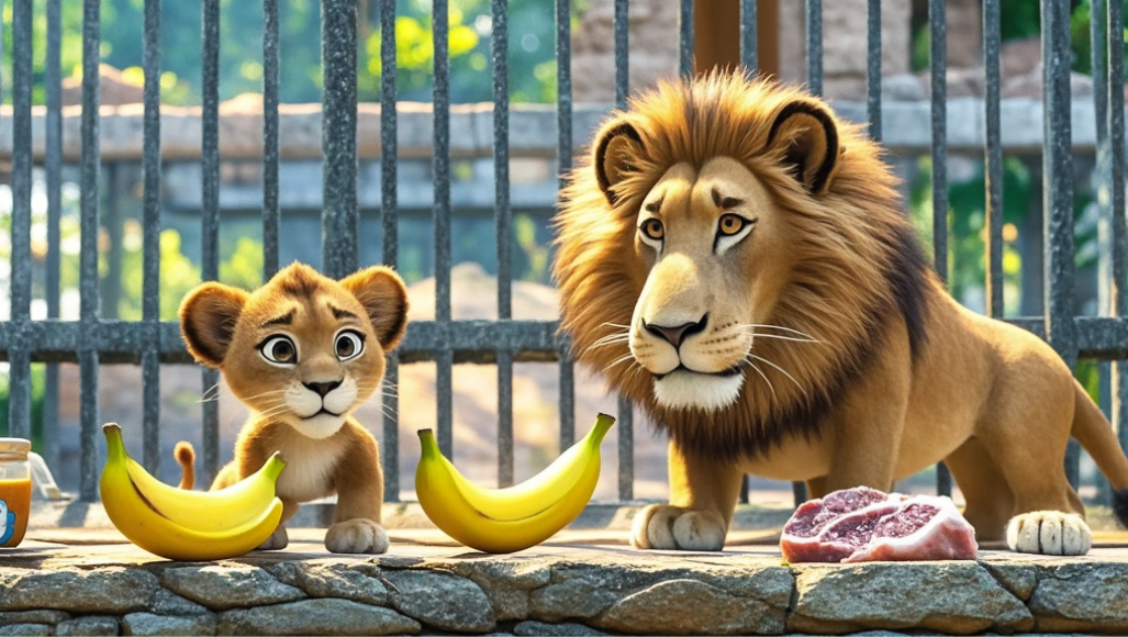 动物园新来了一只年轻的小狮子,它和老狮子关在同一个笼子里。管理员每次来喂食,总是给年轻狮子一根香蕉,给老狮子一大块肉。
