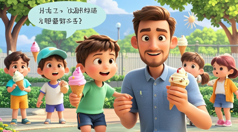 爸爸带儿子到公园玩。看到很多小朋友在吃冰激凌,儿子就说:“吃冰激凌坏牙,肚子疼,我不吃。