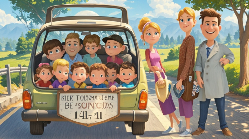 然而,当一辆装有许多小脑瓜的旅行车从后面超过他们时,她吃了一惊:“那辆车上有多少个孩子?”