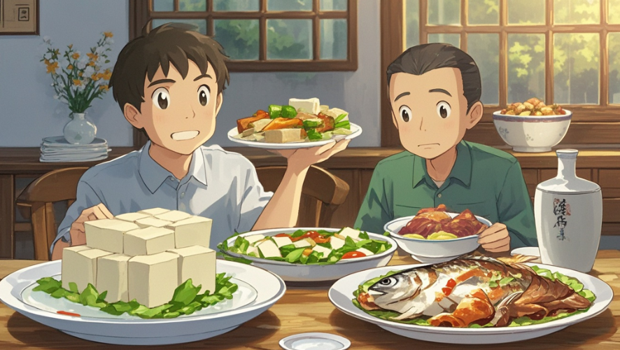 可是吃饭时,甲却专挑鱼和肉吃,一下都不碰豆腐。乙感到很奇怪,甲又解释道:“豆腐是我的命,可我要是见了鱼呀肉呀,就连命也不要了!”