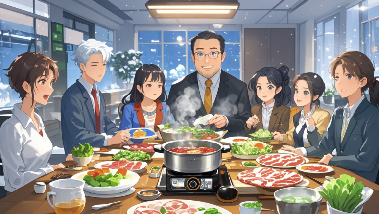 话说某天,办公室里来了场“冬日火锅局”,几个同事决定下班后聚餐吃火锅,结果消息传得太快,最后办公室的十几个人都想一起参加。可大家一商量,发现没法订到大桌,只能提前找个空地“自助”火锅!于是,大家合力从家里带来了小电锅、蔬菜、肉片,甚至连火锅底料都备齐了。下班后,办公室瞬间变成了“火锅店”,电锅全开,热气腾腾。结果,老板突然推门进来,看到这景象忍不住笑了:“你们是直接把办公室变成‘冬日暖心餐厅’了吗?”大家也不好意思,但老板随后说:“快点涮,别让我等太久。”最后,火锅局在办公室成功举办,大家笑着说:“冬天能吃上热腾腾的火锅,冻着也值了!”