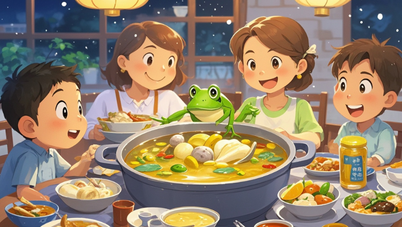 小明睁大眼睛问:“那是什么秘密配料?”妈妈神秘地回答:“是一只跳进锅里的青蛙。”全家人听后都笑了起来。