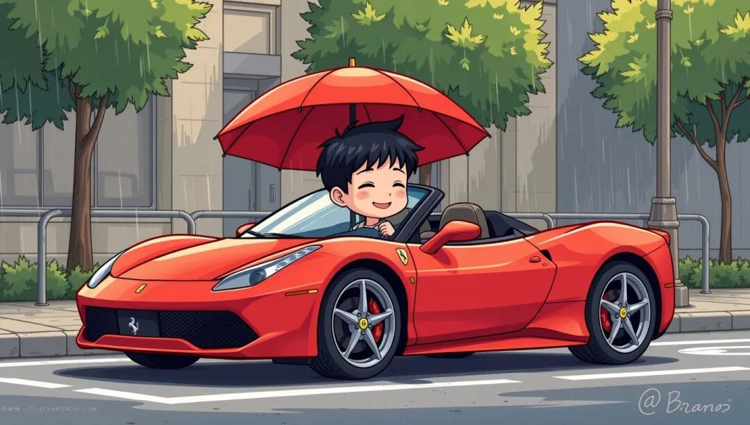 乐乐不屑地说:“有啥好的,遇上下雨天坐在车里还要自己打伞。”