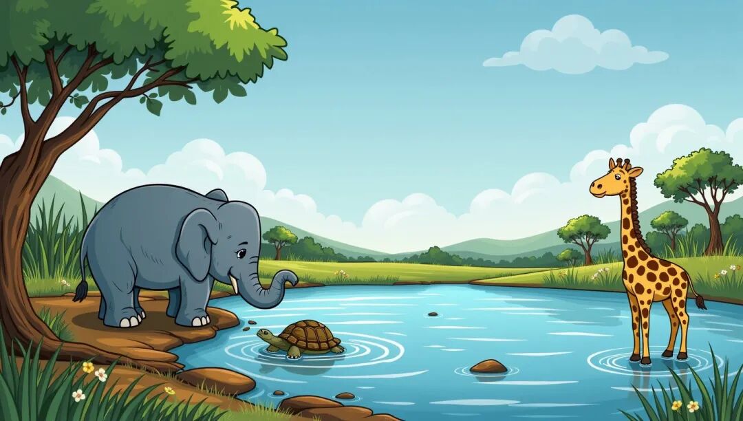 小河边,一头大象正在喝水。忽然,它看见一只乌龟在河边睡觉,嘴里还说着梦话。