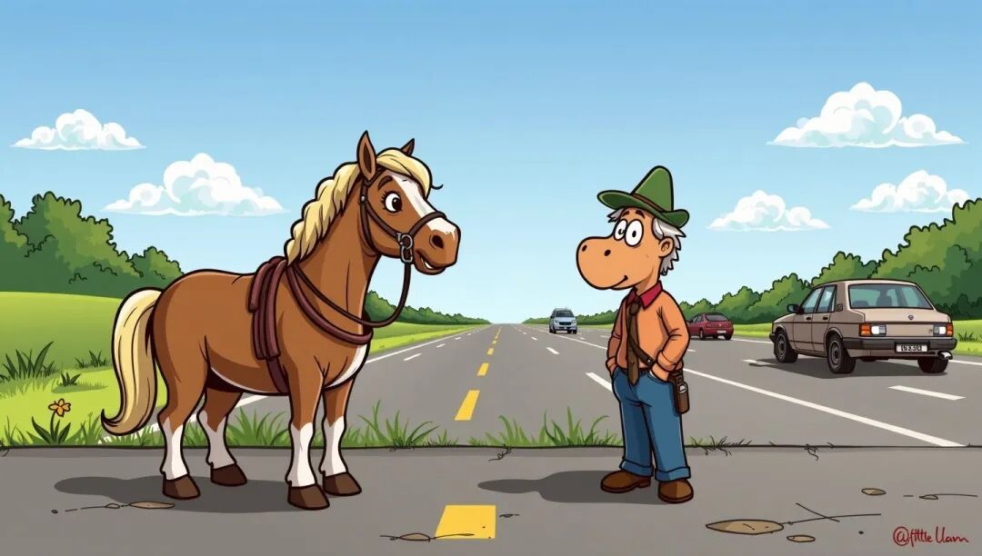 两匹老马站在高速公路旁看着来来往往的汽车,它们发现驾驶员身上都系着安全带