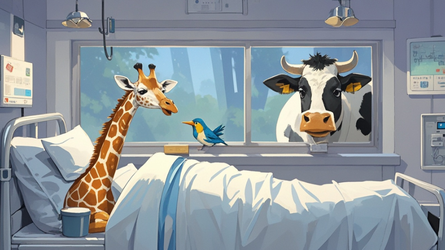 长颈鹿住院了,小鸟和老牛隔着病房的窗户看它。小鸟问老牛:“它自从进了医院就一直躺着吗?”老牛答:“是啊。”