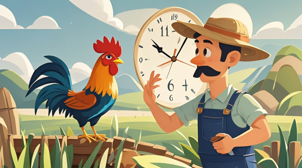 有一个农民养了一只公鸡,他听说公鸡能报时,于是决定试一试。当农民问公鸡几点钟的时候,公鸡竟然毫不犹豫地回答:“咕咕咕咕咕咕咕咕咕!”农民非常失望,抱怨道:“这只公鸡真是糟糕,连时间都不知道。”