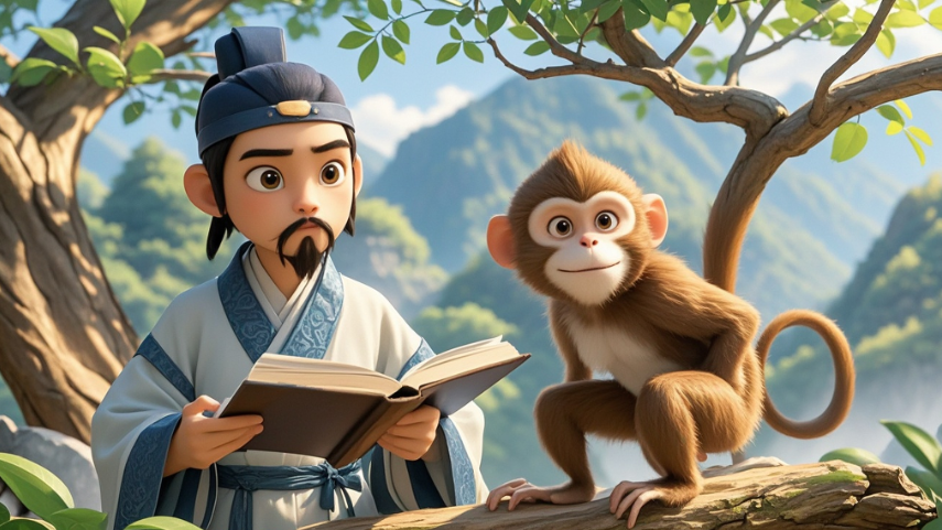 有个书生自命不凡,整天沉迷于读书,却毫无实际本领。有一天,他遇到了一只猴子,猴子问他:“你会爬树吗?”书生骄傲地回答:“我是读书人,当然不会爬树。”猴子笑眯眯地说:“那你也没资格嘲笑我不会读书。”