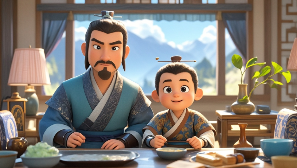 父亲和儿子正坐在电视前一起观赏《三国演义》的剧集。在广告播放期间,父亲不自觉地打了个哈欠,同时随口念出了古话:“兵来将挡,水来土掩。”