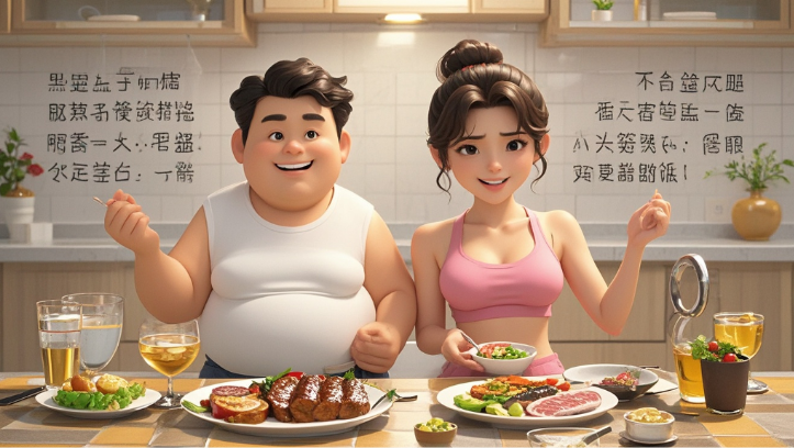 张三的妻子是一位对美食情有独钟的人,每一餐她都会有一番肉类的美食。然而,饭后的她常常会懊悔地抚摸着自己圆润的肚子,自言自语道:“唉,我真的应该减肥了。”这样的情景让张三感到既好笑又无奈。