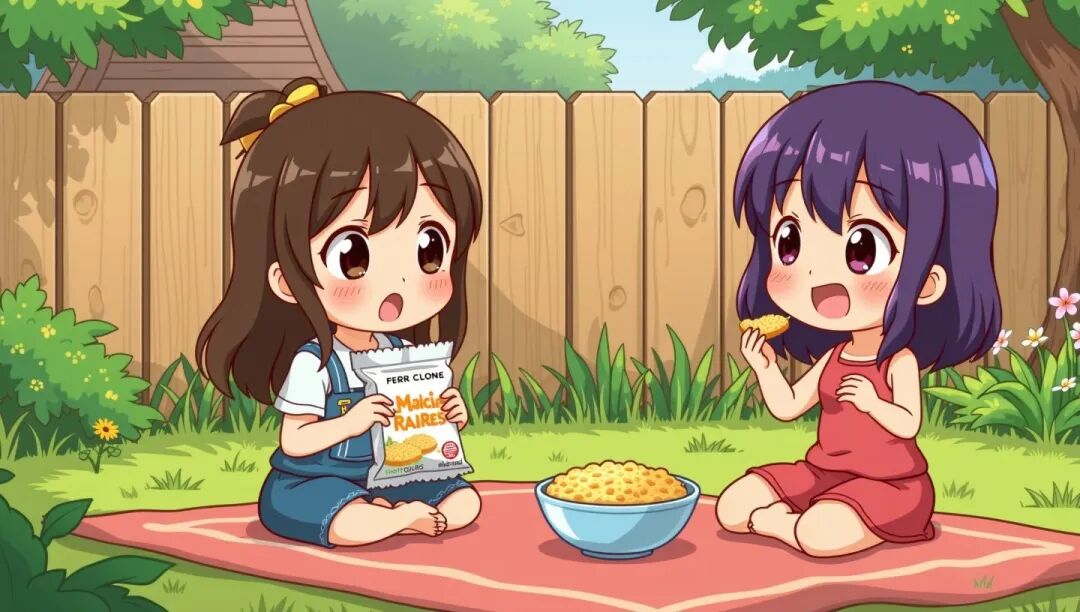 妹妹拿了一包锅巴在院子里吃得津津有味。姐姐在旁边眼巴巴地看着,想吃又不好意思开口。