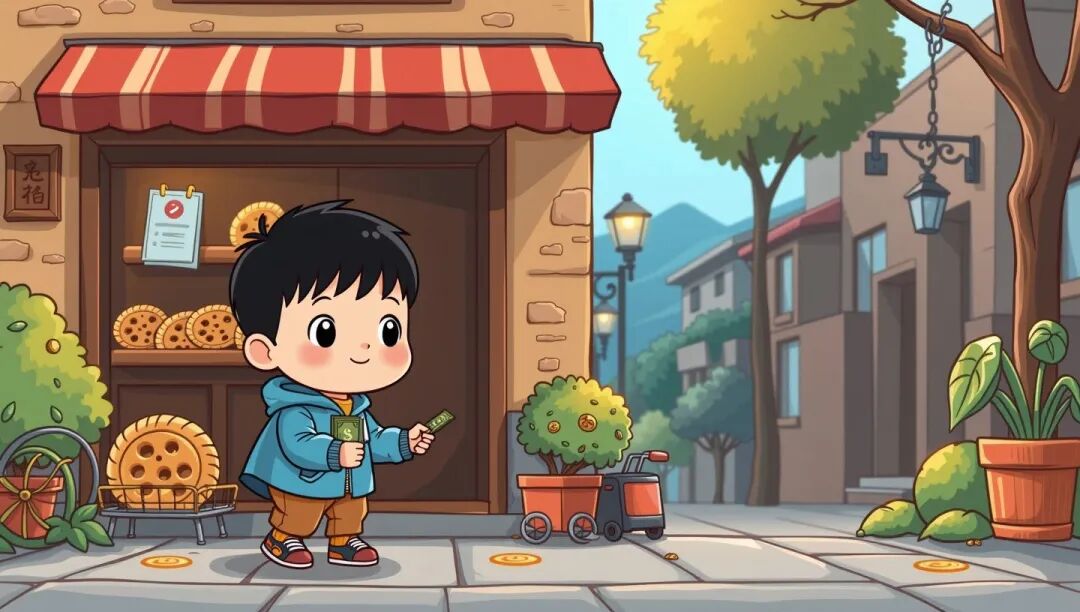 妈妈给4岁的儿子小浩一块钱,让他自己去小卖店买饼干。