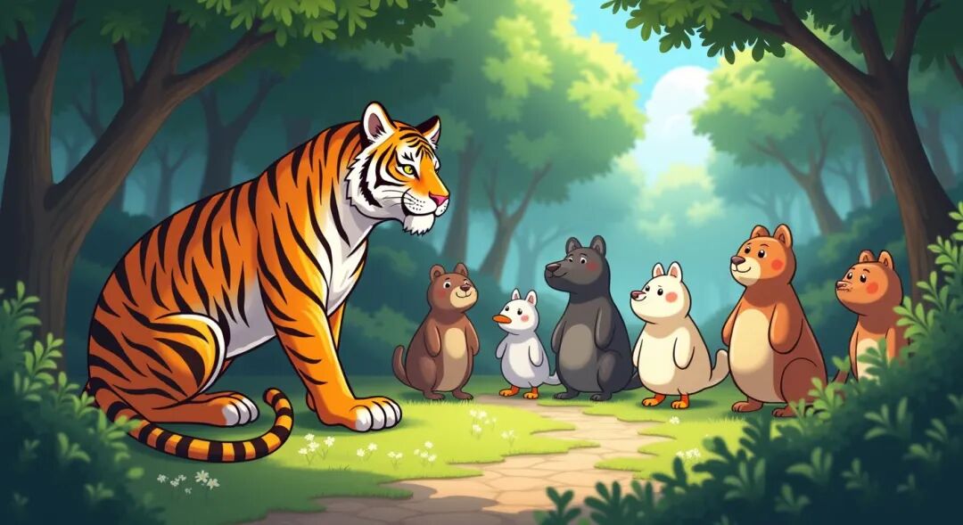 动物王国里,老虎召集动物们开会。会上,所有小动物都不敢说话。