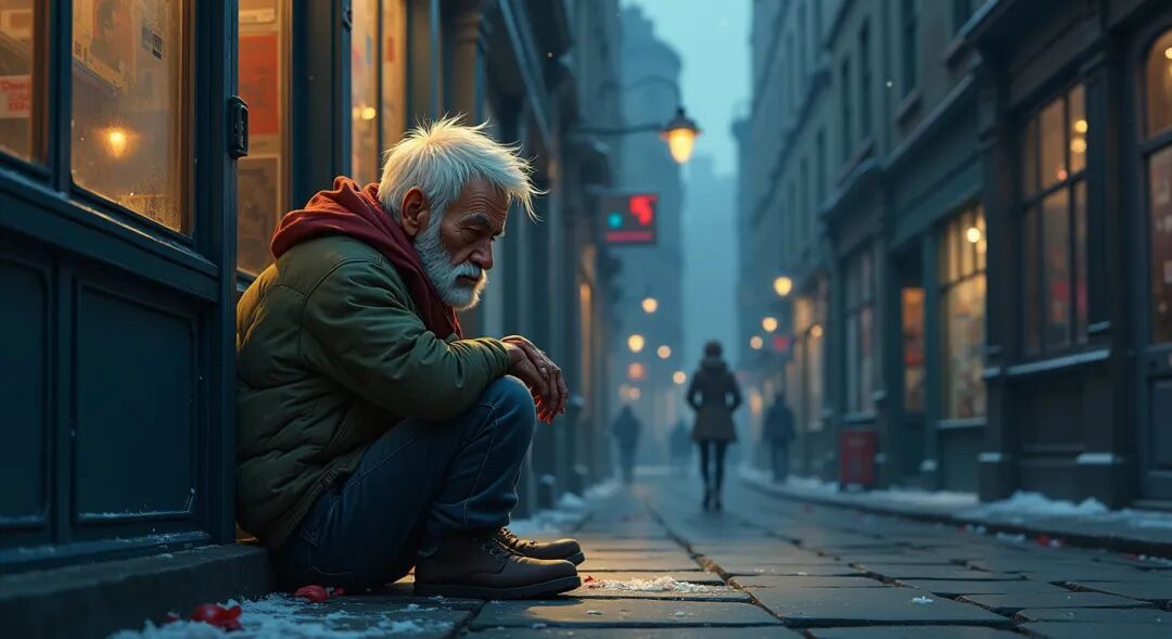 两位摄影师在伦敦相遇,其中一人对另一人说;“今天早,我在地铁的出口,遇见一个年老憔悴的乞丐向我计钱 他冷得瑟瑟发抖,脸上被纹密布,在萧条的街景中,更显得他衣精单薄、凄苦无助。我看了以后,心里十分难过。
