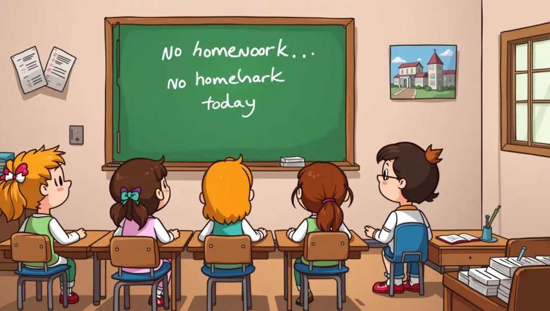 老师放学前在黑板上写了“今天没有作业”几个大字,全班顿时欢呼起来。