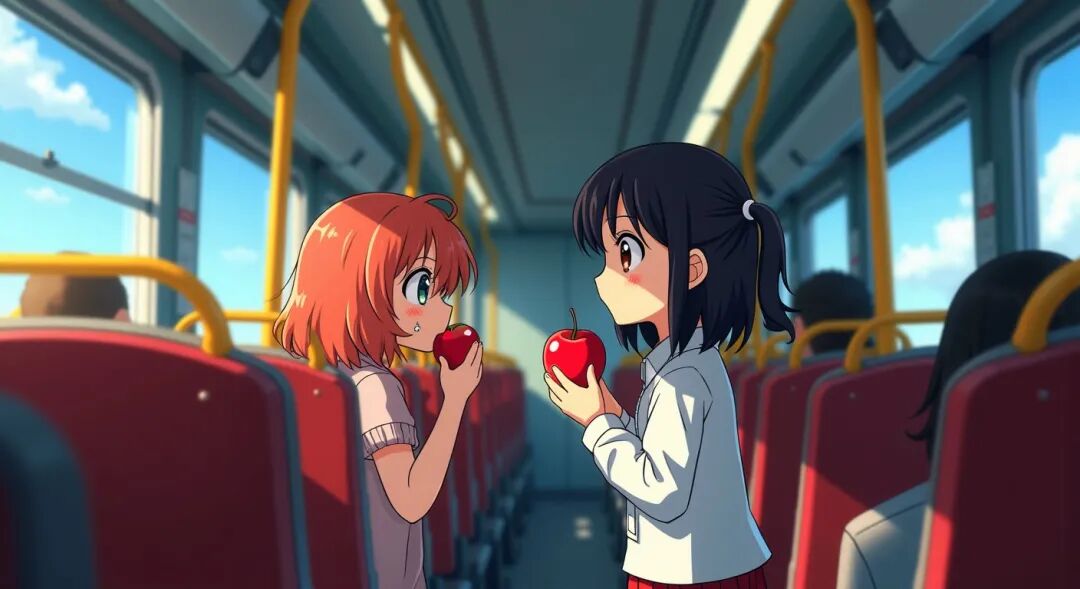 小明看到她手中的红苹果口水直流,马上接过苹果,把座位让给了小女孩。