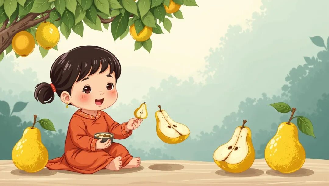 一天,外婆买了一袋梨,她拿了一个大梨削了皮,怕灵灵吃不了,就切成两半,恰好一半大,一半小