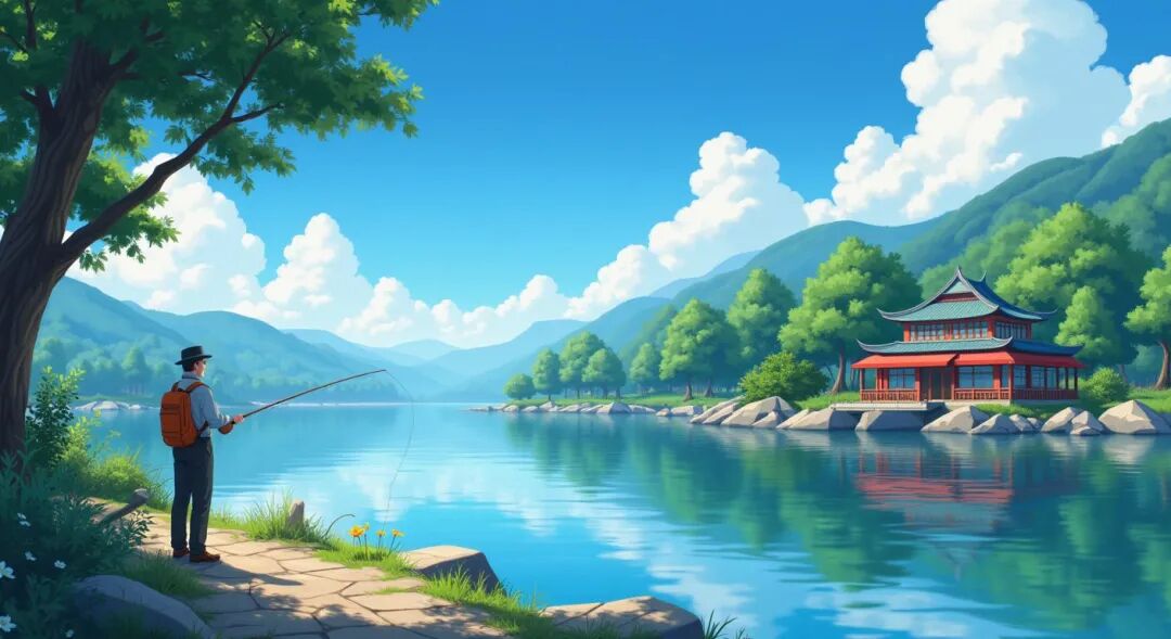 一天早上,一位先生在湖边钓鱼,他等呀等,可鱼儿就不上钩。