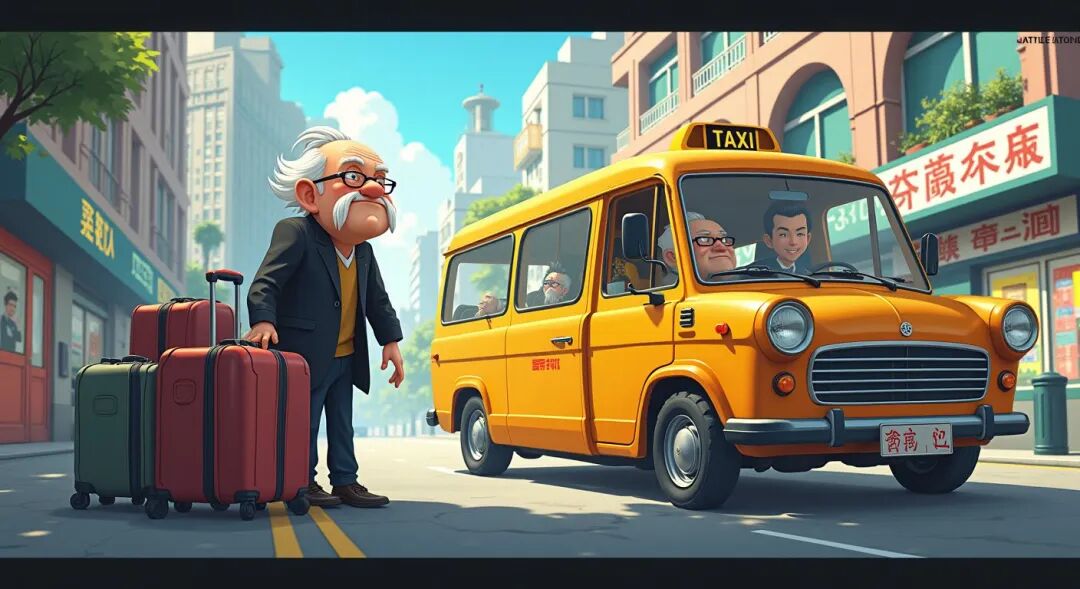 一个吝啬鬼要远行,行李非常多,于是叫了一辆出租车。