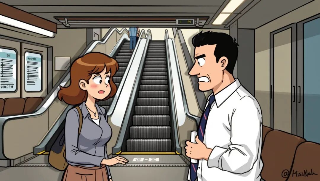 “什么?你说你在扶梯上站了两个小时?你真是个傻瓜!你干吗不坐着等呢?”