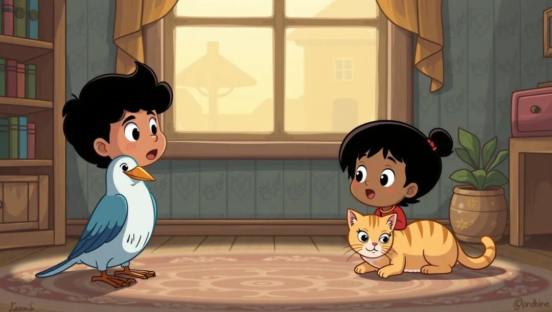 龙龙告诉阿明:“我们家有只会唱歌的鸟和一只喜欢爬来爬去的波斯猫。”