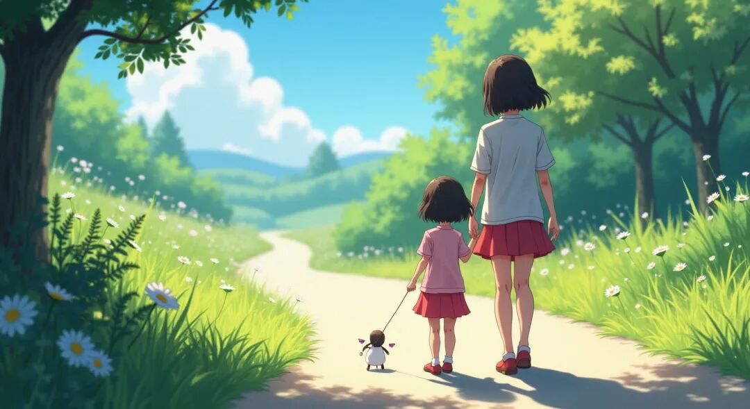 姑姑在卧室里喷上灭蚊药后,带小侄女出去散步。