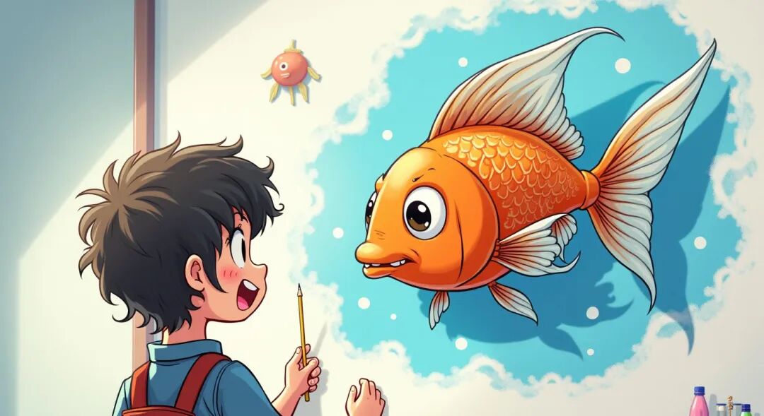 德里坐在那里一动不动,老师生气地说:“限你一个星期,画出和黑板上一模一样的100条鱼来。”