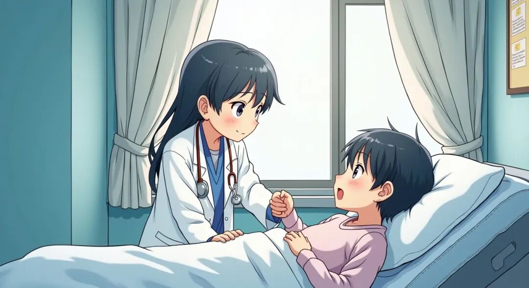 朋友来到病房探望他。在病床边,朋友握着他的手,关切地问道:“你还好吧?医生怎么说?”